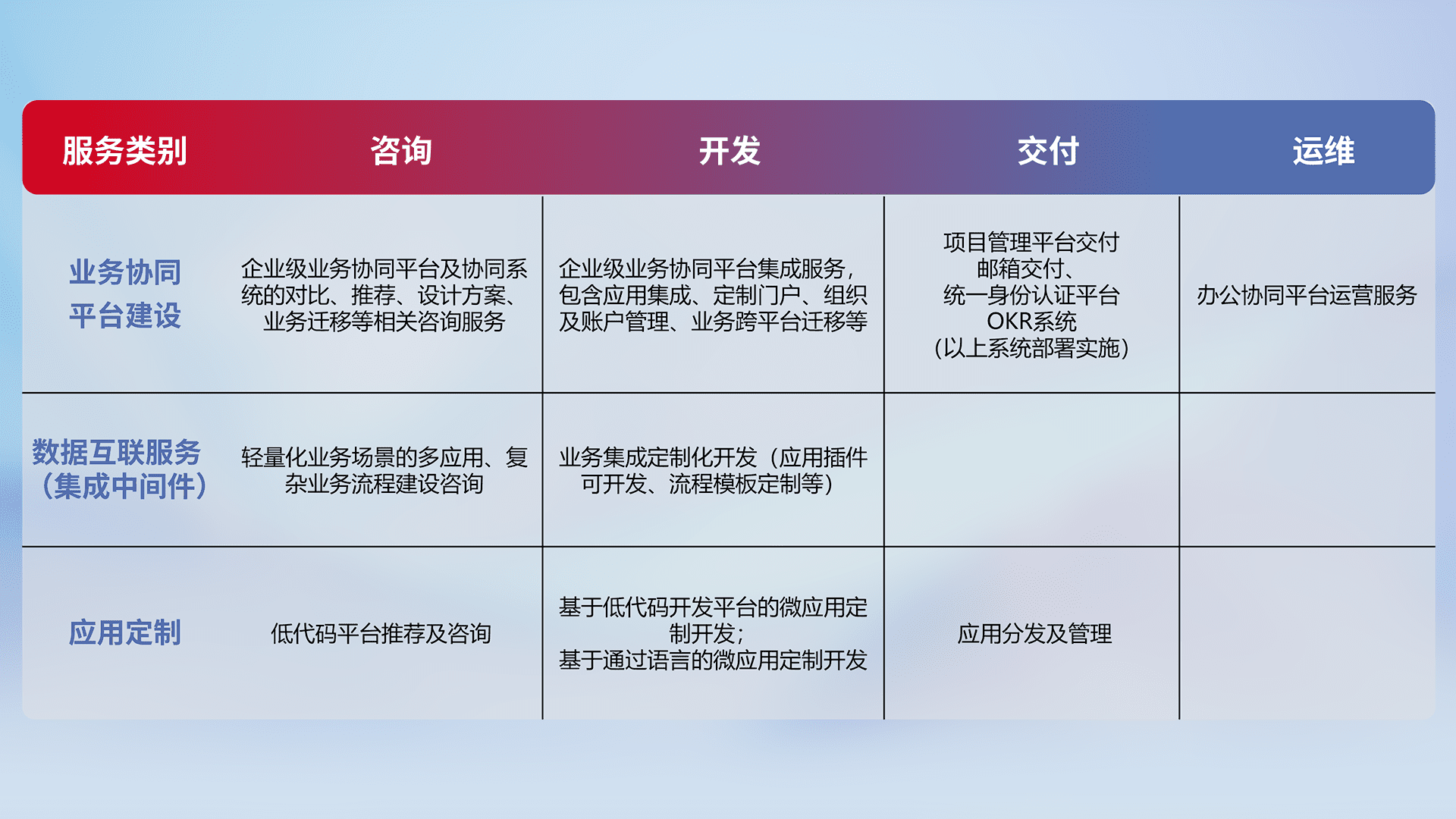 针对钉钉、、企微、、、、IDaas等平台级产品提供产品的规划、、方案、、、交付、、、定制化开发等服务,,,实现如统一协同办公、、、、智能客户服务、、、混合会议管理、、、、智能数据查询、、、等业务场景,,,,实现数字化转型。。